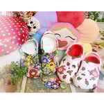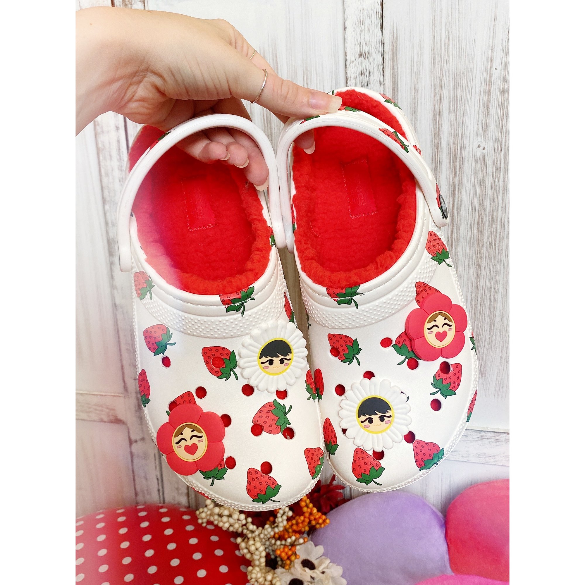 The charms are weatherproof and made of PVC rubber, each charm varies in size but they are all around 1.8" (the tangerine is 1.4"). Perfect for decking out your shoes in some BTS flair!