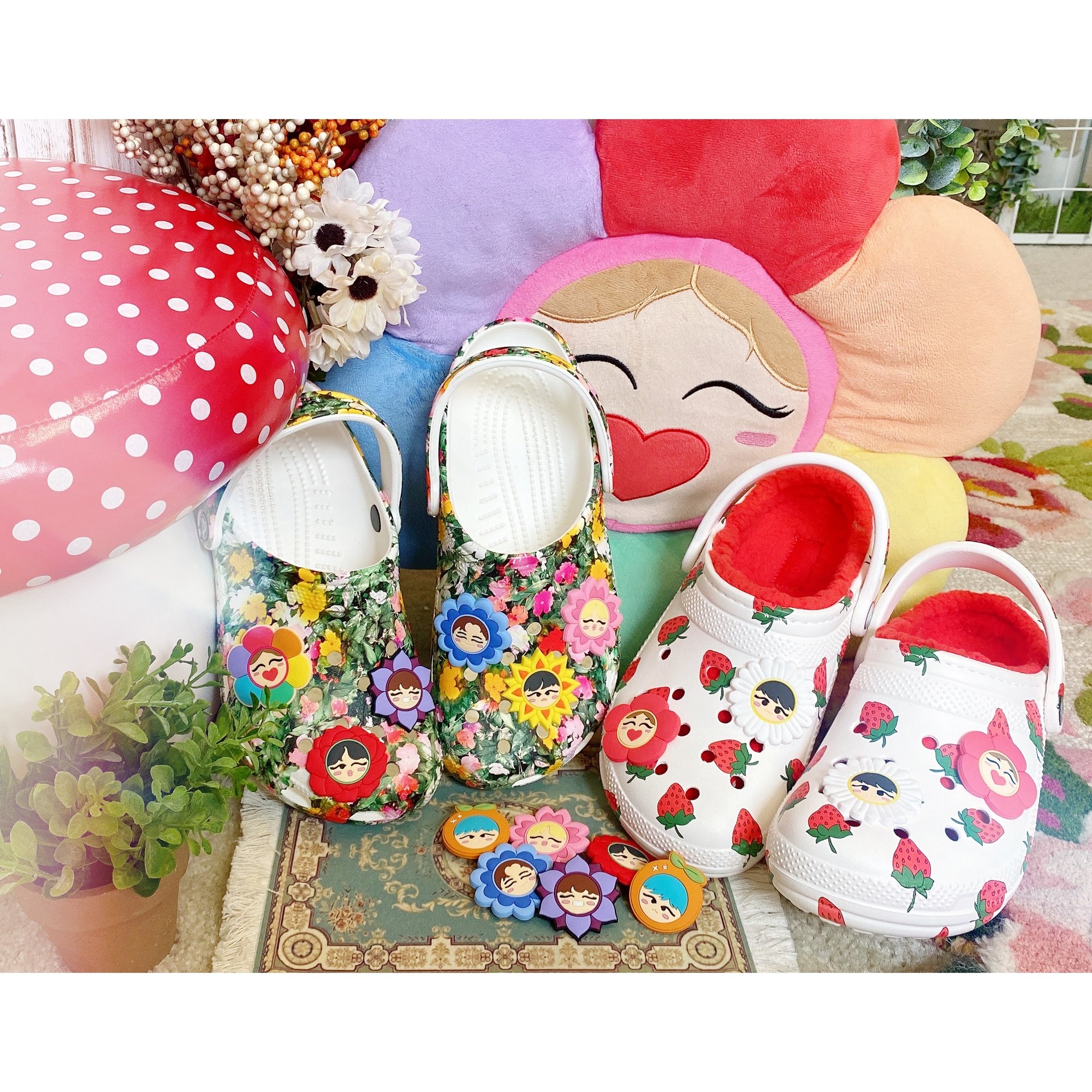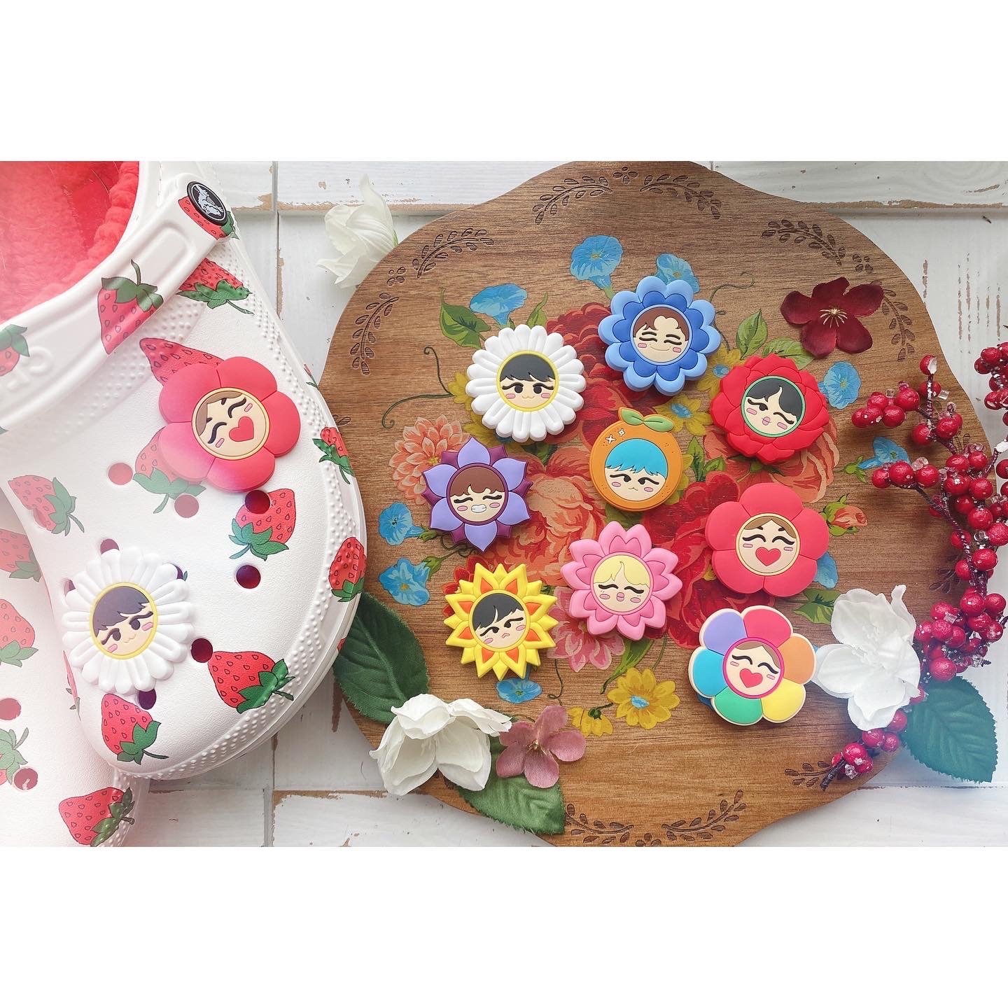 Shoe charms of the Bangtan Boys, each as a lovely little flower! Also ft. Suga (Yoongi) as a Tangerine. The charms are sold individually, but there is a set of all 9 designs available and a set of just the 8 flower designs.