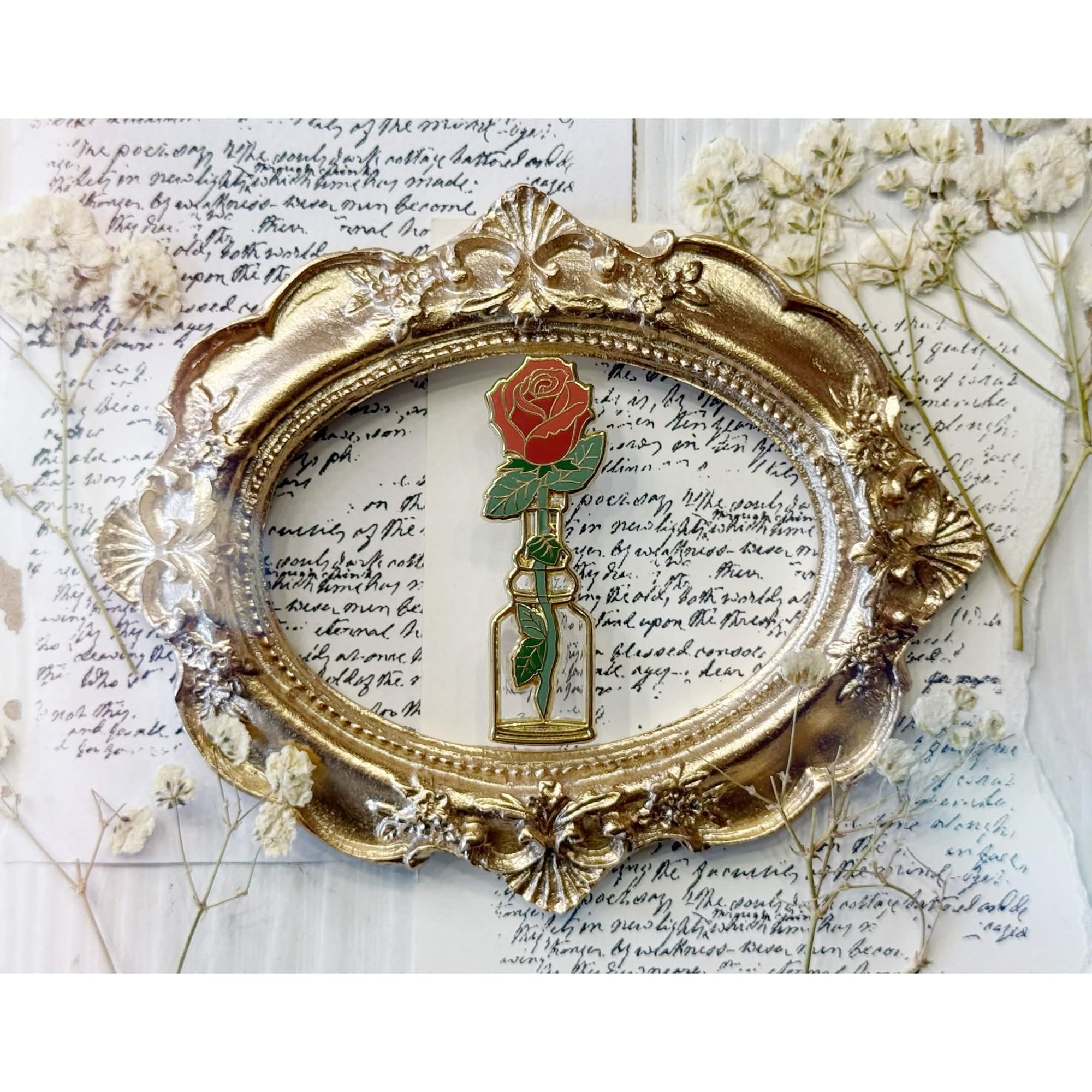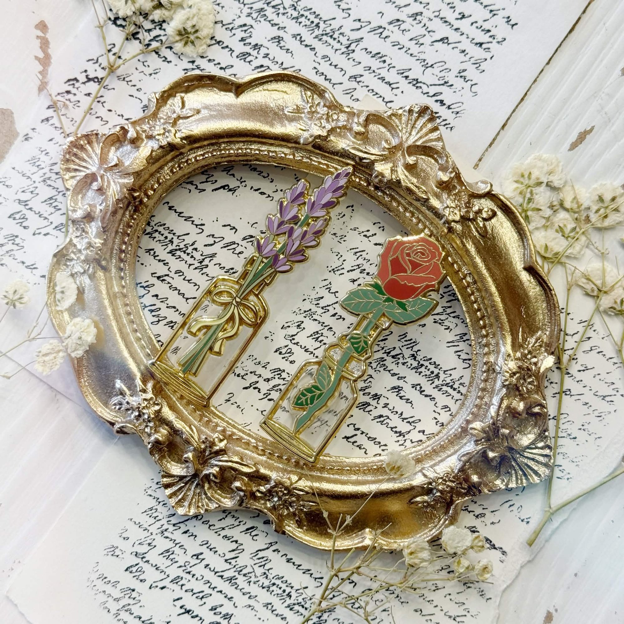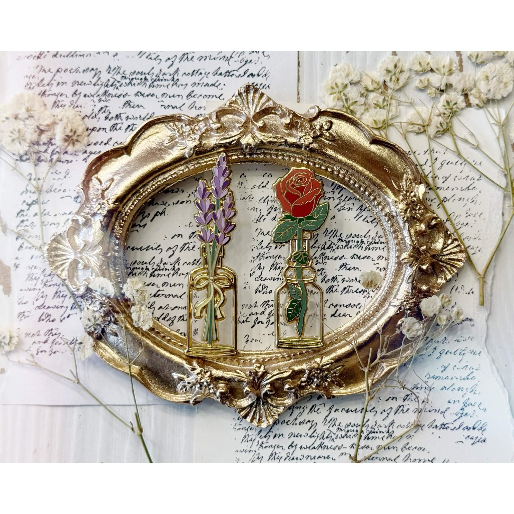 A lovely lavender bunch and a rose in a bottle! These pins feature clear epoxy to mimic the look of a real glass bottle.