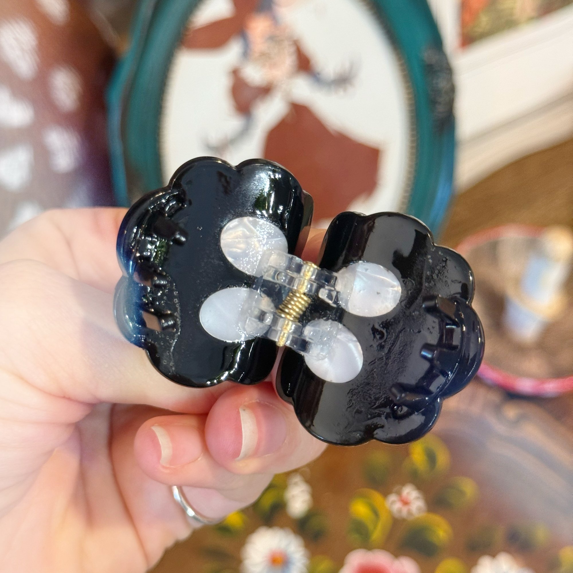 The claw clip is sturdy black plastic and 1.5" long with pearlescent white details.
