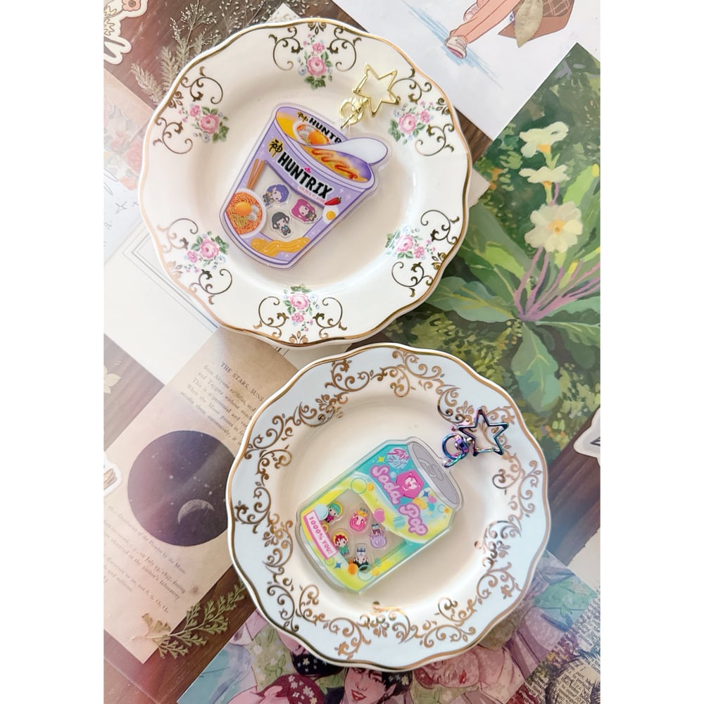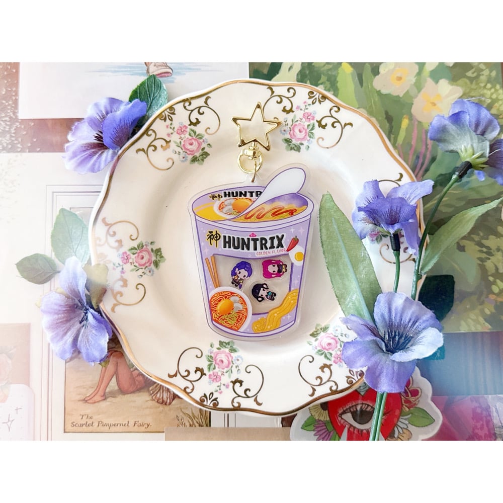 A Ramyeon shaker keychain featuring Huntrix from K-Pop Demon Hunters!