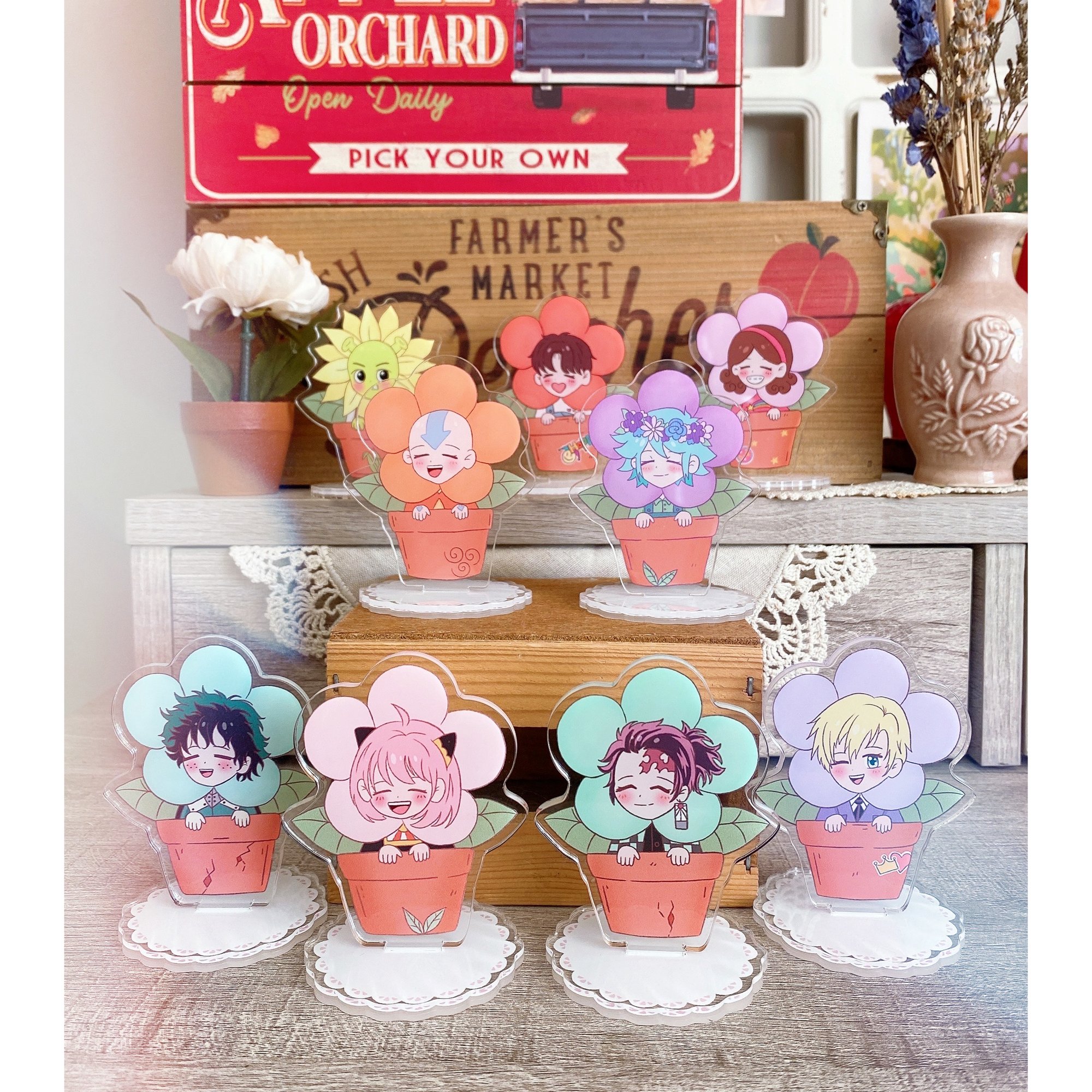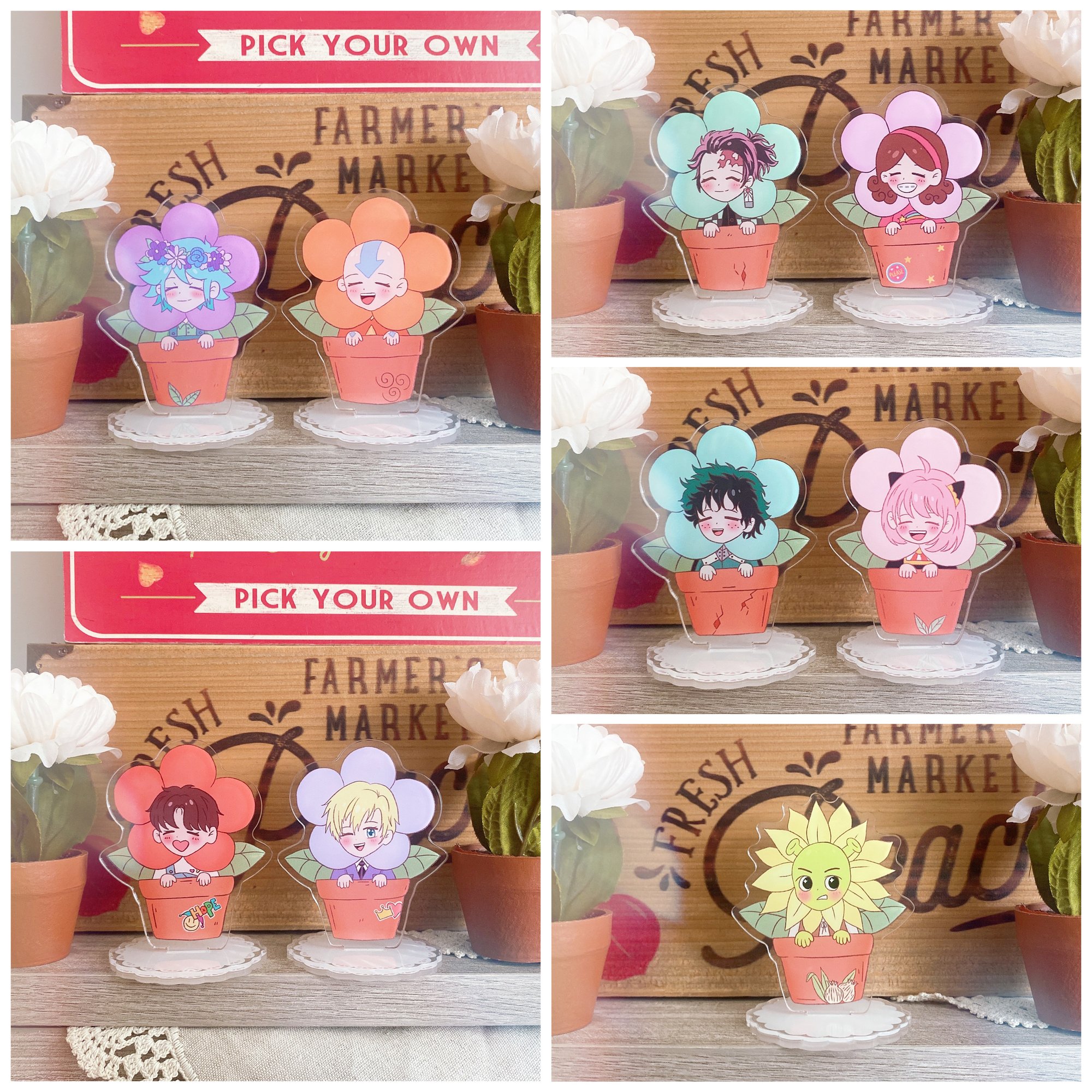 Cute little acrylic standees of your favorite characters as little potted flowers!