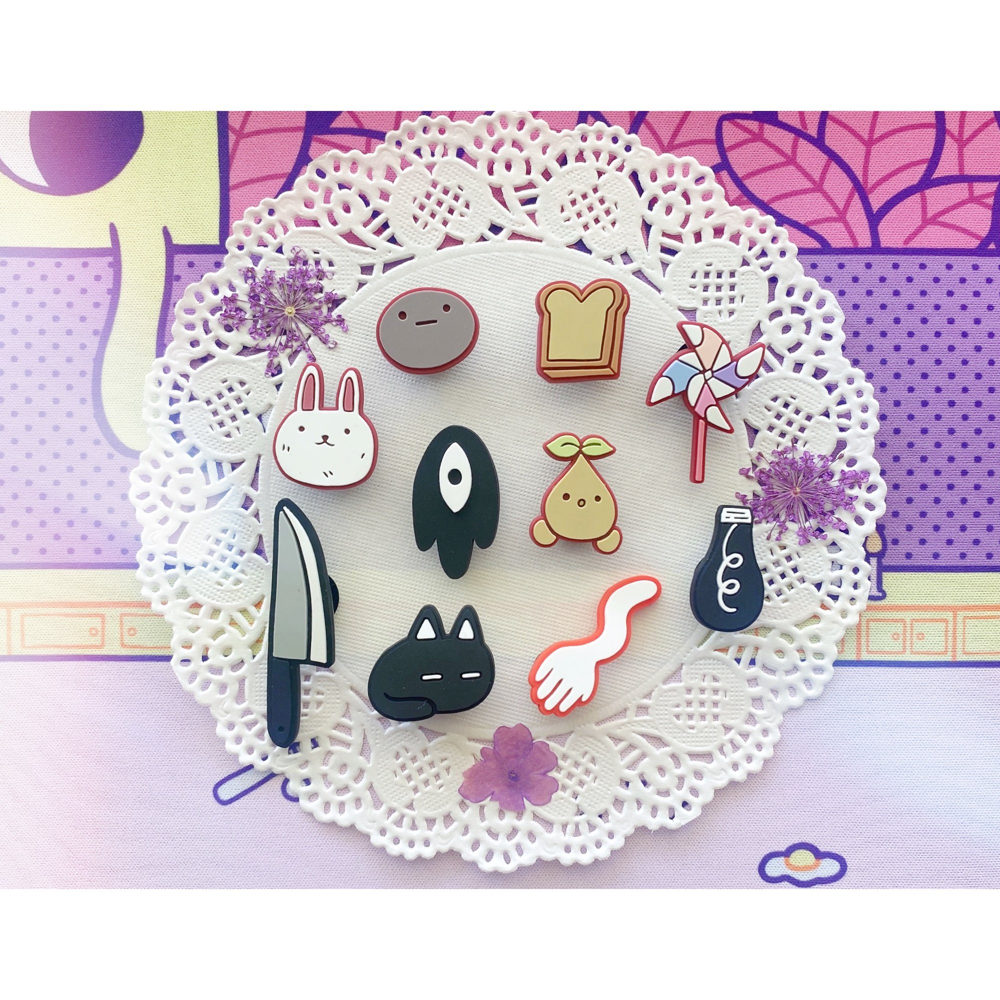 A series of shoe/ croc charms (jibbitz) based on the pixel horror game Omori and the designs of Omocat!