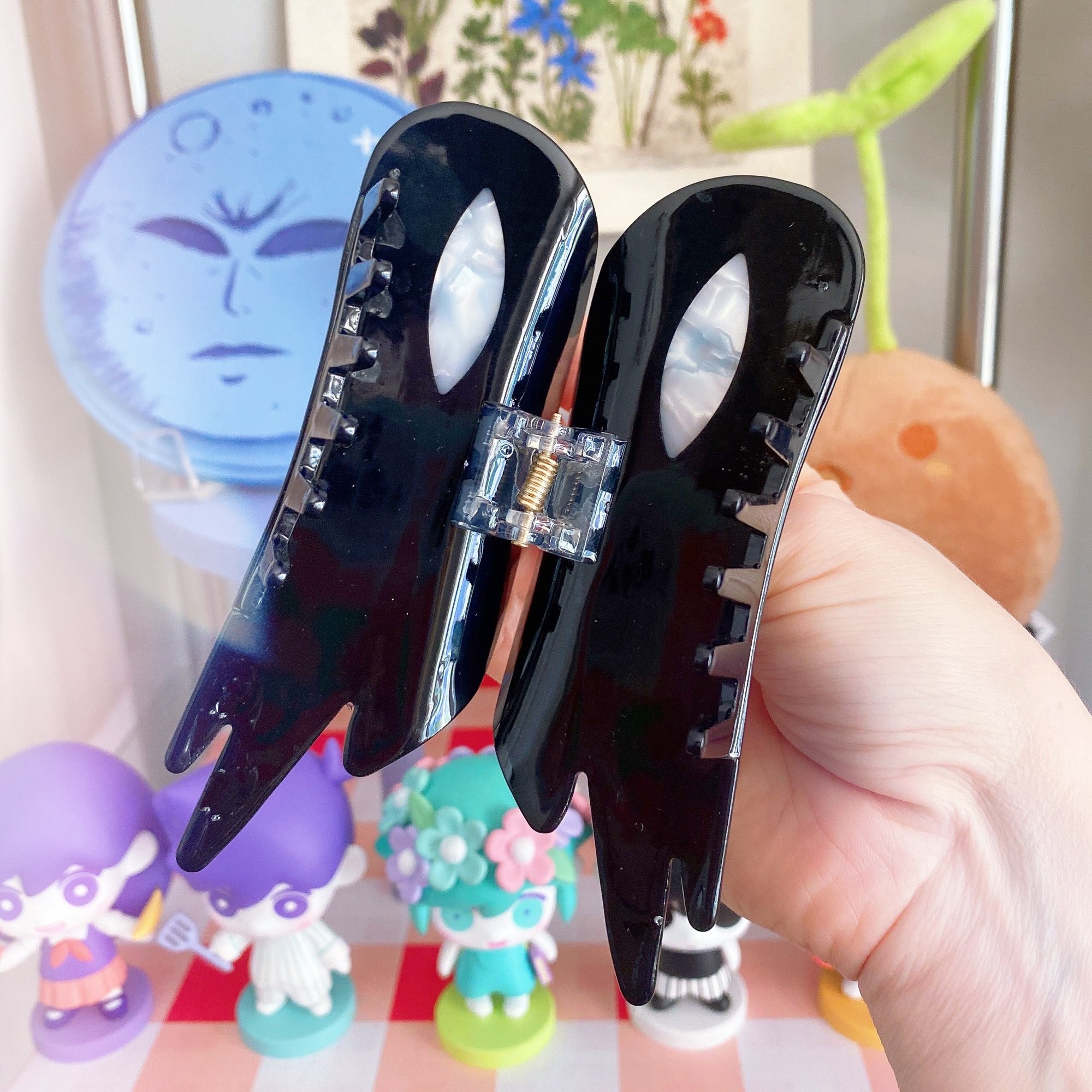 The claw clip is sturdy black plastic and 12.5cm long with pearlescent white details.