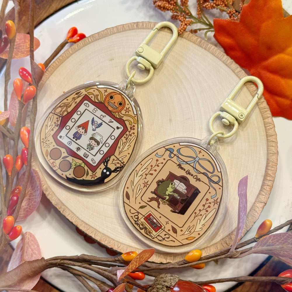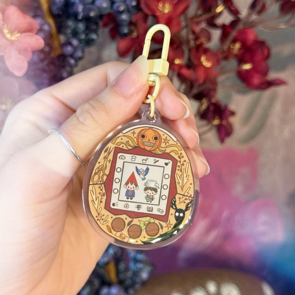 An adorable Tamagotchi inspired keychain featuring the characters from Over the Garden Wall! The cutest little keychain for the coziest fall show.