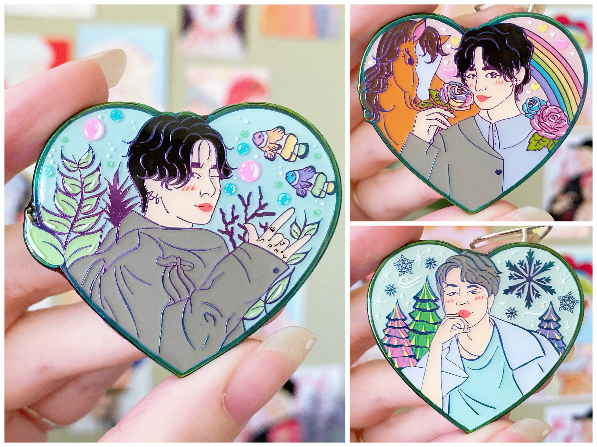 Each pin is rainbow plated, soft enamel with a clear epoxy coating on top, a little less than 2" wide (with the exception of Namjoon who is 2.25" wide), and have two back posts