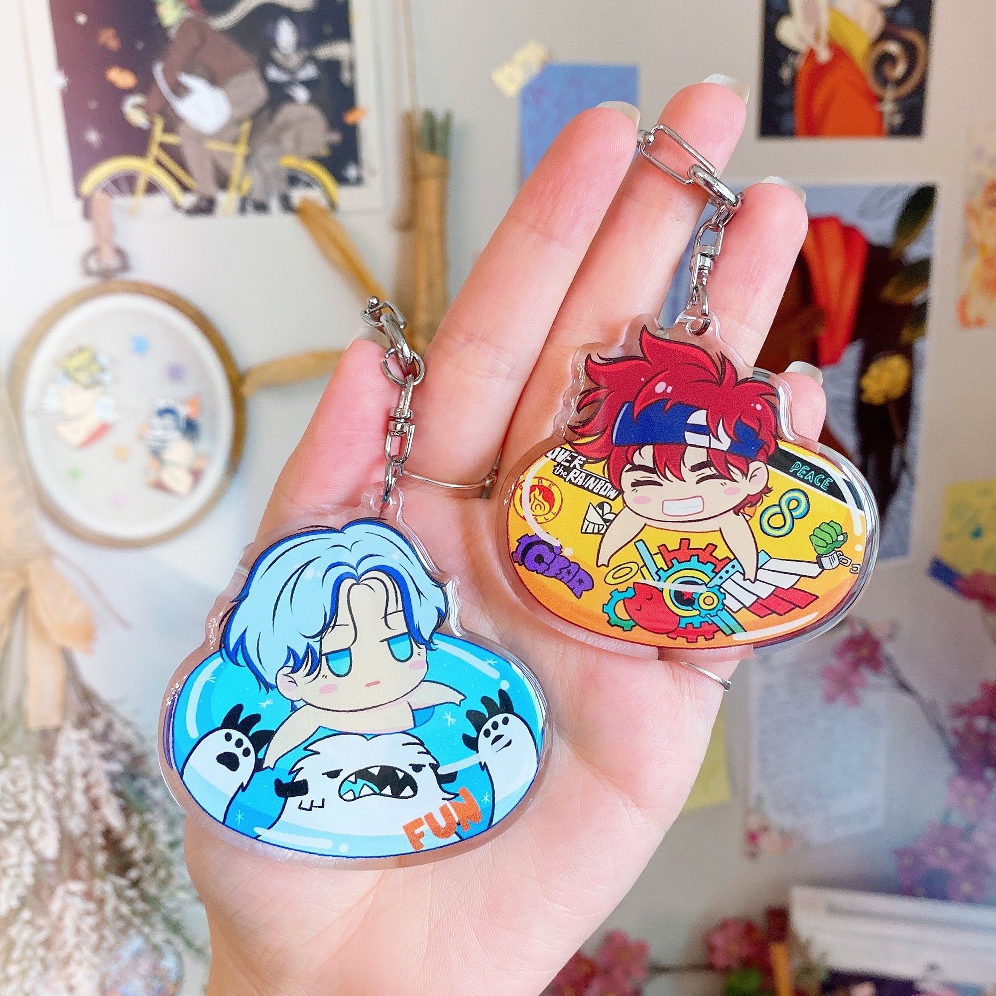 The boys from the anime Sk8 the Infinity in pool floaties inspired by their skateboards!